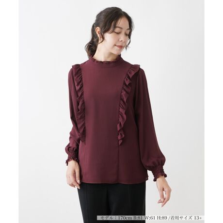 細やかなシワ感のあるポリエステル生地を使用した、リラクシーなシルエットのブラウス。袖はふわりと膨らみをもたせ、袖口にシャーリングを施すことでキャンディスリーブ風のデザインを作り出しています。ネック周りやフロントに施されたフリルがほんのり甘い華やかなエッセンスに。バックネックの涙あきはボタン開閉が可能。ワイドパンツでカジュアルに仕上げたり、スカートを合わせてエレガントな雰囲気をまとったり、お好みでコーディネートのアレンジが楽しめます。