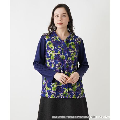 フロント部分に水彩画タッチのアーティスティックなフラワー柄が彩る、新鮮な印象を与える切り替えデザインのボウタイブラウス。フラワー柄と無地のコントラストが美しく、エレガントな華やかさを引き立てます。すっきりとしたシルエットでボトムスを選ばず、パンツにもスカートにも合わせやすいアイテム。オンにもオフにも使える一枚として、カジュアルな日常からオフィスシーンまで幅広く活躍します。