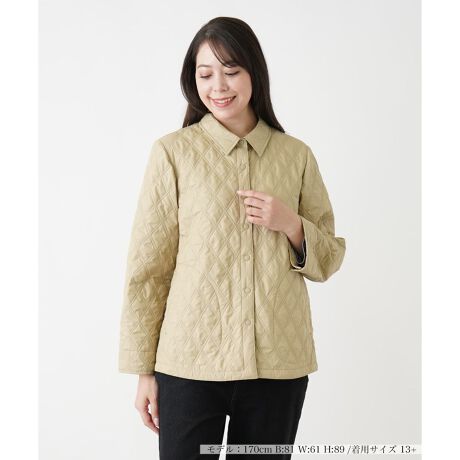 ダイヤモンドキルティングが施された、洗練された佇まいのジャケット。フロントはスナップボタン仕様で簡単に着脱ができる手軽さが嬉しいポイントです。襟付きのクラシカルなデザインは、カジュアルなデニムスタイルにはもちろん、スカートやテーラードパンツと合わせたきれいめスタイルにもぴったり。軽量ながら中わたがしっかりと入っており、程よい保温性を備えているため、季節の変わり目や少し肌寒い日にも快適に着用できます。シルエットがすっきりとしているため、ボトムスを選ばずに合わせやすく、さりげないおしゃれを楽しめる一着です。