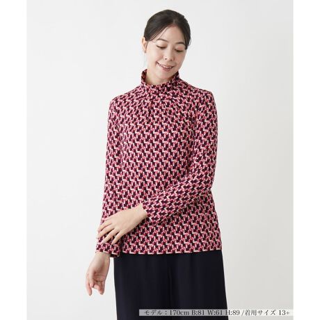 オプティカルな幾何学柄が印象的なハイネックカットソー。ネックラインにはタックを施し、立体的で洗練されたシルエットを生み出しています。デザインのこだわりが際立つ一枚は、ワイドパンツと合わせてリラックス感のあるカジュアルスタイルにも、ロングスカートを組み合わせて上品で大人フェミニンなコーディネートにもマッチ。日常から週末のお出かけまで多彩なシーンで幅広く活躍するアイテムです。