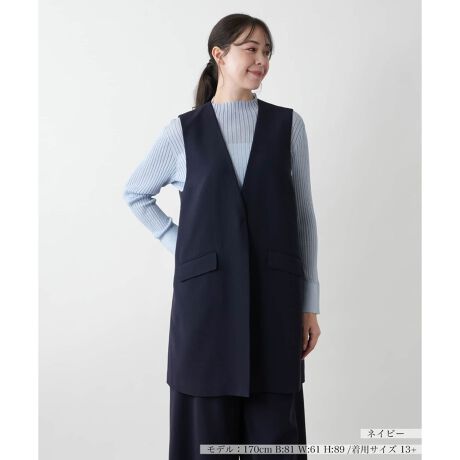 洗練されたIラインシルエットを描き出すロングベスト。シャープに仕立てられたネックラインが、顔周りをすっきりと見せつつ、絶妙な抜け感を演出。シンプルながらも計算されたディテールが、大人の洗練されたスタイルを叶えてくれます。前ウエスト左右には、さりげなくレイアウトされたシンプルなフラップポケットをレイアウト。装飾を抑えたクリーンなデザインながら、ポケットのディテールがさりげないアクセントとして効いています。インナーやボトムス次第でさまざまな着こなしが楽しめるのも嬉しいポイント。フロントはスナップボタンにより開閉が可能です。