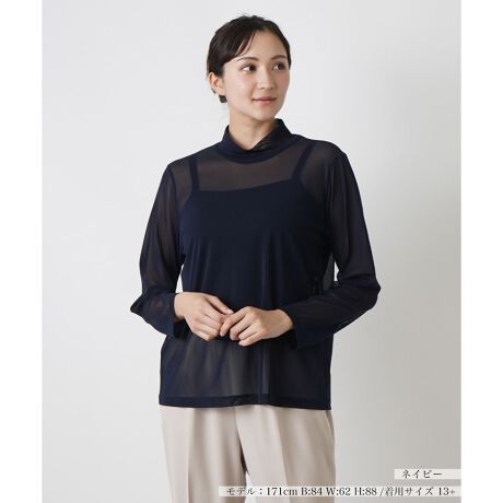 透け感のあるパワーネット素材を使用したハイネックプルオーバー。軽やかで上品な魅力を放ち、程よい伸縮性と通気性を兼ね備え、快適な着心地が特徴。首元に優しく寄り添う高さのあるネックラインが、気になるデコルテをエレガントにカバーし、洗練された印象を演出。袖や身頃には自然なドレープが生まれ、女性らしい柔らかさを引き立てます。ジャケットやコートといったアウターのインナーとしても活躍し、幅広いスタイリングに対応します。