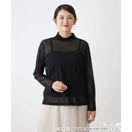 透け感のあるパワーネット素材を使用したハイネックプルオーバー。軽やかで上品な魅力を放ち、程よい伸縮性と通気性を兼ね備え、快適な着心地が特徴。首元に優しく寄り添う高さのあるネックラインが、気になるデコルテをエレガントにカバーし、洗練された印象を演出。袖や身頃には自然なドレープが生まれ、女性らしい柔らかさを引き立てます。ジャケットやコートといったアウターのインナーとしても活躍し、幅広いスタイリングに対応します。