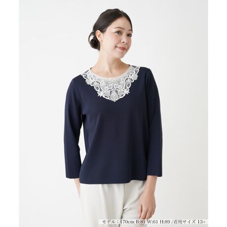 フロント襟周りにあしらわれた繊細なレースがさりげなく華やかさをプラスし、上品で女性らしい雰囲気を引き立てるカットソー。一枚でさらりと着こなせるだけでなく、ジャケットのインナーとしても活躍する汎用性の高さが魅力です。ほどよく体にフィットするシルエットは、動きやすさと美しいラインを両立し、着崩れしにくいのもポイント。オンオフ問わず幅広いシーンで使えるため、クローゼットにあると重宝します。バックはループボタンにより開閉が可能。