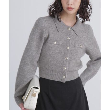 毛足の短いショートシャギー糸を使用した小さい襟がポイントのニット。ジャガード織りなので密度と肉感があり、だれる事なくキレイに長く活躍してくれます。ポケットは見せかけ(飾り)ですっきりとさせ、アウターインでもかさばりにくいシルエットです。金色ボタンは少しシルバーカラーが混ざったような色味で、ギラギラしすぎず着やすくなっています。コンパクトなサイズ感なので、1枚でもカーディガンでも着用いただけます。※モデルの着用画像の場合、光の当たり具合により、実際の色味と異なって見えることがございます。色味は、商品単体の画像をご参照ください。