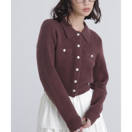毛足の短いショートシャギー糸を使用した小さい襟がポイントのニット。ジャガード織りなので密度と肉感があり、だれる事なくキレイに長く活躍してくれます。ポケットは見せかけ(飾り)ですっきりとさせ、アウターインでもかさばりにくいシルエットです。金色ボタンは少しシルバーカラーが混ざったような色味で、ギラギラしすぎず着やすくなっています。コンパクトなサイズ感なので、1枚でもカーディガンでも着用いただけます。※モデルの着用画像の場合、光の当たり具合により、実際の色味と異なって見えることがございます。色味は、商品単体の画像をご参照ください。