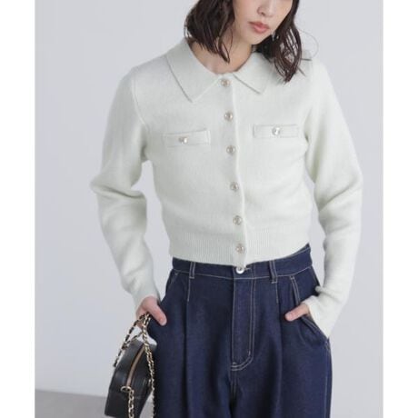 毛足の短いショートシャギー糸を使用した小さい襟がポイントのニット。ジャガード織りなので密度と肉感があり、だれる事なくキレイに長く活躍してくれます。ポケットは見せかけ(飾り)ですっきりとさせ、アウターインでもかさばりにくいシルエットです。金色ボタンは少しシルバーカラーが混ざったような色味で、ギラギラしすぎず着やすくなっています。コンパクトなサイズ感なので、1枚でもカーディガンでも着用いただけます。※モデルの着用画像の場合、光の当たり具合により、実際の色味と異なって見えることがございます。色味は、商品単体の画像をご参照ください。