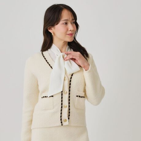 ラメフェザーモールの華やかなきらめきと、メタルチェーンブレードのゴージャスなアクセントが眼を惹く主役級ニットカーディガン。