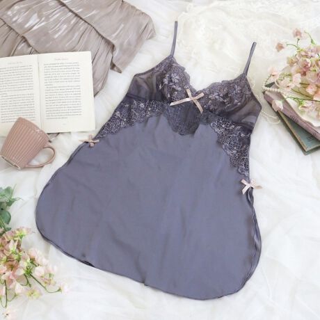アンティークレースをあしらったウェディングドレスをイメージしたシリーズです。レースにあしらわれた小花は、パッカー手法とアップリケを組み合わせて、華やかで立体的な印象に仕上がりました。その周りにはさりげなくチェック柄をほどこすことで、クラシカルな表情に。アップリケのラインストーンと全体にあしらわれた繊細なラメ糸が、キラキラと上品な輝きを演出します。バスト下はストレッチレースと刺繍レースで大胆に切り替えて、異なる肌の透け感がラグジュアリーな印象に。身生地には深めのスリットとリボンをプラスして、ラウンドカットした裾が動くたびにふんわりと揺れる、可愛らしいシルエットが完成しました。カラーもウェディングドレスを連想させる、大人の気品あふれるWhite・Gray・Mintのワントーンで展開しています。