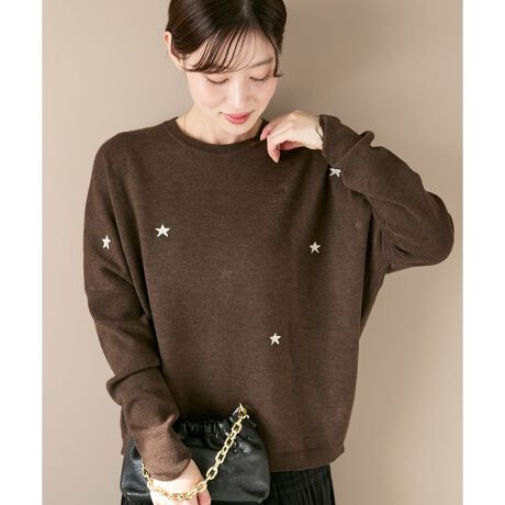 落ち着いたベースカラーにさりげなく散りばめられたスター刺繍がひかるクルーネックニット。