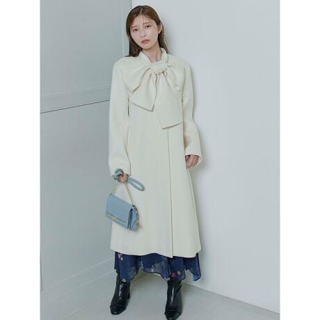 無駄を削ぎ落としたノーカラーデザインに、同素材で仕立てたリボンストールが映え、知的で華やかな印象に。