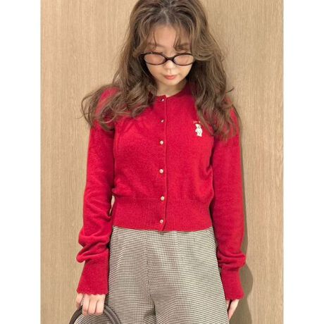 「LILY BROWN」で毎シーズン人気を集める、Lily Bearニットカーディガン。左胸にちょこんとあしらったLily Bearの刺繍や、袖口のスカラップ仕様など、細部までこだわった愛らしいデザインが魅力です。昨年同様にウールとフォックス混の糸を使用して上品に仕上げ、シンプルなシルエットでスカートにもパンツにも合わせやすい一着です。秋冬のレイヤードスタイルにぴったりの、長く愛用できる定番アイテムです。