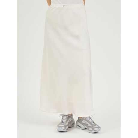 ストンとしたシルエットが品のある印象にのナロースカート。ウエストはイージーなゴム仕様でノンストレスに着用でき、ウエストゴムのemmi刺繍も今期らしいデザインポイント。