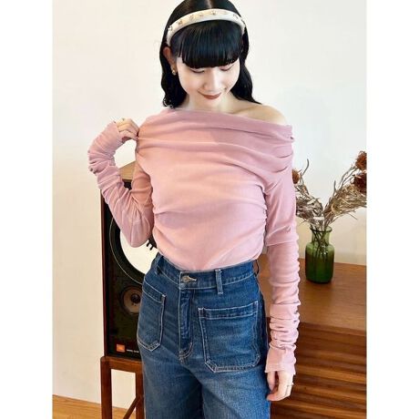 上品な透け感が魅力のフロッキーチュールを使用した、大人の肌見せが叶うトップス。肩をしっかり覆って着ると、胸元にあしらったタックデザインが際立ち、華やかなアクセントに。エレガントに肌をカバーできるため、オフィスシーンにも活躍します。肩を落としてオフショルダー風に着用すれば、女性らしいセンシュアルな印象に。1枚で印象が変わる、着回し力の高いアイテムです。ヴィンテージサテンのミニスカートと合わせた、バレエコアスタイルもおすすめ。