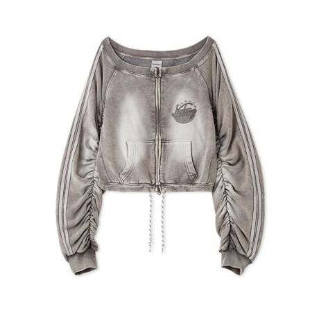 1980 年代よりアメリカの大学やスポーツチームのライセンスグッズを手掛けてきた「NUTMEG」と 「SNIDEL」のコラボレーション企画。ケミカルウォッシュ加工を加えてヴィンテージ感を出したスウェット生地でお作りしたオフショルジップロゴカットプルオーバーがお目見え。ゆるっとメンズライクなシルエットで仕上げていますが、ゆったりとした襟ぐりで肩を落としてオフショルダーもしくはワンショルダーでもご着用いただける人気のデザインが絶妙なバランスで華奢見え効果も期待できます。裏起毛の温かなスウェット生地を使用。NUTMEGのロゴ刺繍を胸元に加えてストリート感を引き立てました。フロントはダブルジップ使用。下だけ少し開けて抜け感を出したコーディネートもおすすめです。袖はスポーティなラインに加えてたっぷりとギャザーを入れ、フェミニンに仕上げました。調節もできる裾のドロストコードがワンポイントに。同素材でお作りしている「NUTMEG」コラボのスウェットパンツ(SWCP255099)とセットアップでのご着用もおすすめです。