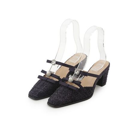 華奢なリボンにビジューを添えた、フェミニンな印象のミュール。足元にさりげない華やかさを演出でき、デイリーからオケージョンまで幅広く活躍。カラーごとに異なる素材で仕立てており、ブラックとライトブルーは艶やかなエナメル、ネイビーは繊細に輝くツイード素材を採用。ソックスとのコーディネートも相性が良く、シーズンレスで取り入れられる一足です。
