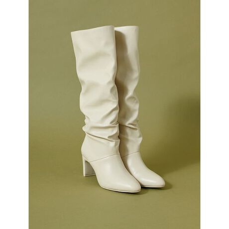 柔らかなシャーリングフェイクレザーを使用して程よくルーズなシルエットで仕上げた、シーズンムードを高めるロングブーツです。足首からふくらはぎにかけて自然なドレープを生み出すデザインで、足元にトレンド感をプラスします。程よく高さのある安定感のあるチャンキーヒールで、脚をキレイに見せつつ、歩きやすく仕上げました。キレイめなミニスカートに合わせたり、シアー感のあるフェミニンなロングワンピースに合わせたり、さまざまなテイストにもマッチ。筒周りは程よくゆとりがあり、履きやすいデザインです。程よく艶感のあるフェイクレザーです。優しい色味にも合わせやすいアイボリー、汎用性の高いブラック、チョコレートカラーのブラウンの3色展開です。