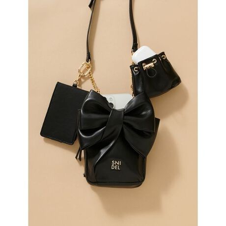 フロントの立体リボンディテールが華やかな、ミニマルながらも収納力抜群で機能性の高い人気のリボンショルダーバッグが届きました。取り外しが可能なカードケースとミニポーチがセットで3つのパーツを自由にアレンジできる仕様です。リボンショルダーバッグは、お財布やハンカチやコスメなどが収納できるファスナー付きのメインポケットに、パスポート類なども入れられる小さめのファスナー付きポケット、スマートフォンなどが入れられるオープンポケットも付いていて、すぐに必要なものが取り出せる仕様に。フロントにはSNIDELロゴを添えてエレガントに仕上げました。ミニポーチは巾着型で、AirPodsなどを収納できます。カードケースは折りたたみ式でスナップボタンで開閉できます。ショルダーストラップは長さ調節が可能です。艶感のあるフェイクレザーを使用。アイボリー、ブラック、イエロー、キャメルの4色展開です。