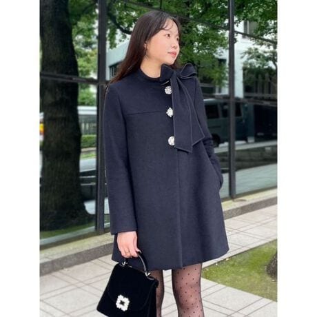 昨年好評だったコートが、今年もアップデートして登場。襟元にあしらったボウタイリボンが視線を引きつけ、まるでワンピースのような着こなしが叶うエレガントなデザインです。Aラインのミニ丈シルエットや、「L.B CANDY STOCK」らしいビジュー釦など、細部まで女性らしさにこだわった贅沢な一着。ドレッシーな装いはもちろん、パンツを合わせてカジュアルダウンすれば洗練されたミックススタイルも楽しめます。