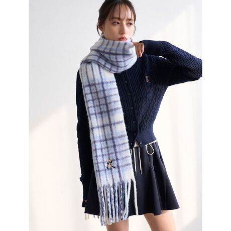 愛らしいベアー刺繍がポイントになったリボンベアーマフラーが届きました。起毛感のあるアクリル素材を使用し、ふわふわと柔らかな肌触りで温かみのあるデザインが魅力です。くるりと巻けば首元にボリュームの出せるアイテム。存在感のある長めのフリンジで動きを出して華やかに仕上げました。温かみのあるアイボリーは無地。ベージュとライトブルーはSNIDELらしい柔らかな色味のチェック柄でお作りしています。それぞれカラーによりベアー刺繍の色味が異なり、スタイリングのアクセントに。アイボリーは赤いマフラーを巻いたベアー刺繍。チェック柄のベージュはライトブルーのマフラーを巻いたベアー刺繍です。チェック柄のライトブルーはネイビーのマフラーを巻いたベアー刺繍を施しました。