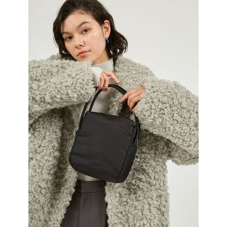 程よい光沢感とスクエア型がトレンドのハンドバッグ。表には同色でemmiロゴの刺繍がポイント。程よい柔らかさで、デイリーはもちろんお出かけなどきれいめなコーディーにも合わせやすい万能バッグです。