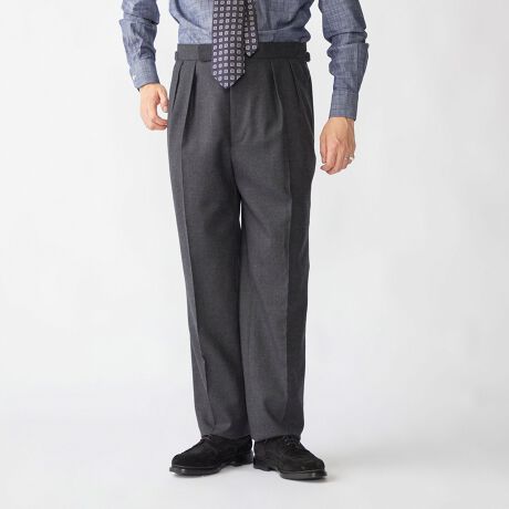 インプリーツに深めの股上、サイドストラップを施した仕様です。