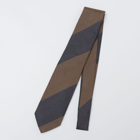 幅広のストライプ柄となっており、一般的なストライプ柄よりもVゾーンに与える印象が強いネクタイです。