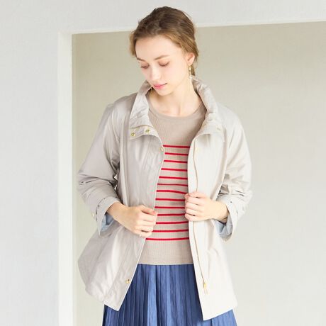 衿元のギャザーやドット釦使いなどややスポーティなディティールを取り入れたブルゾンタイプのコンパクトジャケット。カジュアルスタイルからタウンスタイルにぴったり。さっと織ってサマになるアイテム。