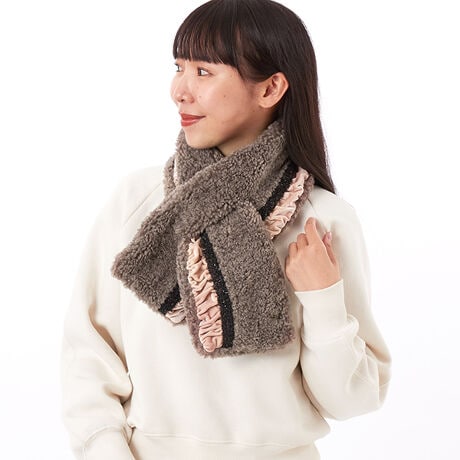 ベルベッドギャザーがガーリーさを引き立てるフェイクファーマフラーです。ベース部分はくせっ毛のようなカーリーファー素材を使用。アクセントにアンティーク風な金属のバタフライチャームが付いています。ロマンティックなコーディネートに仕上がるマフラーです。差込タイプなので、ほどけにくいお作りです。