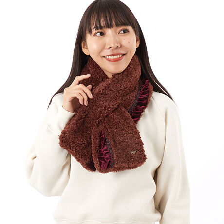 ベルベッドギャザーがガーリーさを引き立てるフェイクファーマフラーです。ベース部分はくせっ毛のようなカーリーファー素材を使用。アクセントにアンティーク風な金属のバタフライチャームが付いています。ロマンティックなコーディネートに仕上がるマフラーです。差込タイプなので、ほどけにくいお作りです。