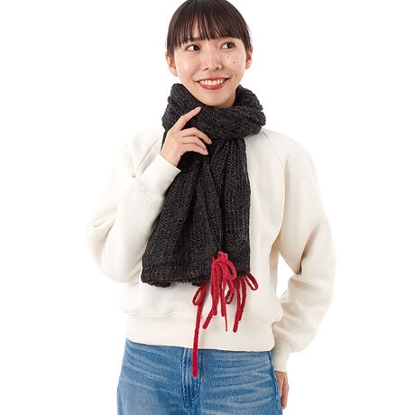 バレエコアなリボン付きニットマフラー。毛足感のあるレーシーな素材。裾のちょうちょ結びの結び目はほどく事が出来る仕様になっています。結び方を変えてチューブストールにも変形でき、ボレロのようなスタイリングも可能です。甘すぎないカラーリング・ガーリー過ぎない程よい辛口感がポイントです。