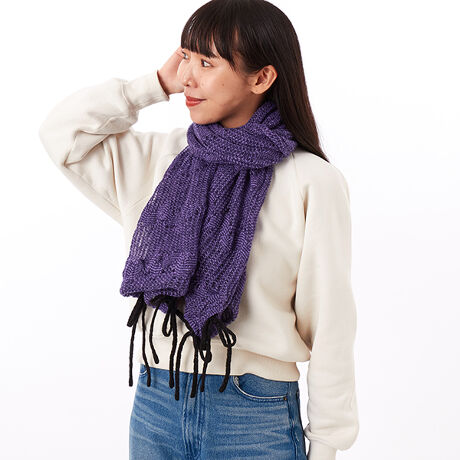 バレエコアなリボン付きニットマフラー。毛足感のあるレーシーな素材。裾のちょうちょ結びの結び目はほどく事が出来る仕様になっています。結び方を変えてチューブストールにも変形でき、ボレロのようなスタイリングも可能です。甘すぎないカラーリング・ガーリー過ぎない程よい辛口感がポイントです。