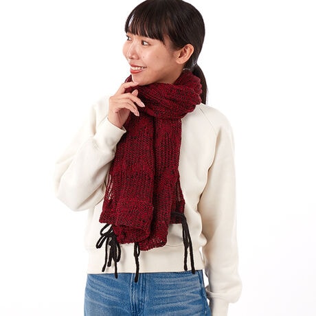 バレエコアなリボン付きニットマフラー。毛足感のあるレーシーな素材。裾のちょうちょ結びの結び目はほどく事が出来る仕様になっています。結び方を変えてチューブストールにも変形でき、ボレロのようなスタイリングも可能です。甘すぎないカラーリング・ガーリー過ぎない程よい辛口感がポイントです。