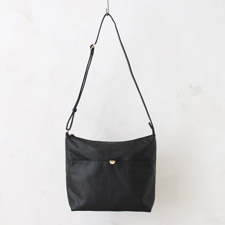 しっとりと手に馴染むソフト合皮素材、フロントにあしらわれた控えめながらも洗練された印象のメタルプレートが、大人の女性らしい上品な輝きをプラス。