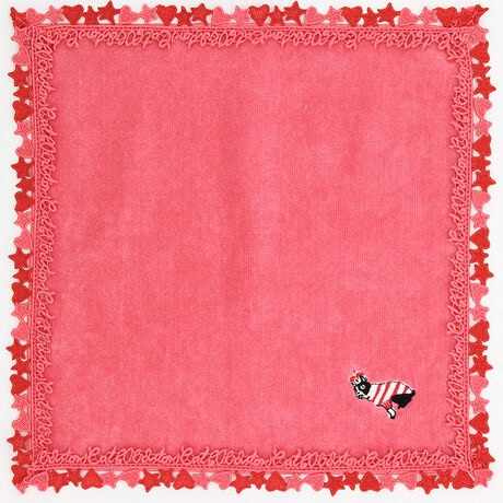 ロゴとハート&星柄のレースで縁取った目を惹く華やかなタオルハンカチ。ボストンテリアの「バーニー」の刺繍もポイントです。
