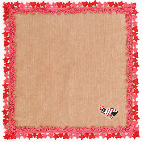 ロゴとハート&星柄のレースで縁取った目を惹く華やかなタオルハンカチ。ボストンテリアの「バーニー」の刺繍もポイントです。