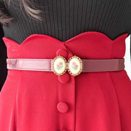 オリジナルのアンティーク調のローズがプリントされたカメオバックルが目を惹くゴムベルト。