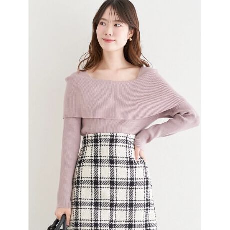 デコルテを美しく見せるオフショルデザインが魅力のニット。