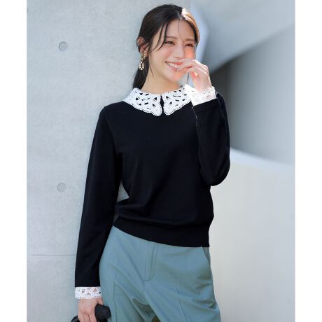 ・レースの襟とカフスを付ければ、オフィスシーンにもぴったりの上品スタイルに。・パンツと合わせればマニッシュで洗練された印象に、スカートと合わせればフェミニンで華やかな着こなしが完成します。 ・レースを取り外してシンプルなニットとして、ジャンパースカートやジャケットのインナーとしても活躍します。 ・袖口は折り返して着用することもでき、様々な表情をお楽しみいただけます。