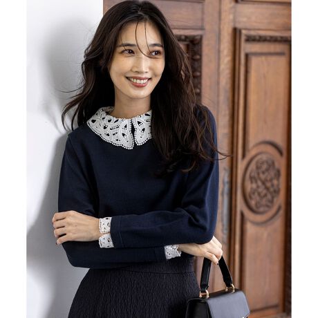 ・レースの襟とカフスを付ければ、オフィスシーンにもぴったりの上品スタイルに。・パンツと合わせればマニッシュで洗練された印象に、スカートと合わせればフェミニンで華やかな着こなしが完成します。 ・レースを取り外してシンプルなニットとして、ジャンパースカートやジャケットのインナーとしても活躍します。 ・袖口は折り返して着用することもでき、様々な表情をお楽しみいただけます。