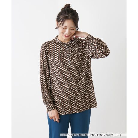 グラフィカルな幾何学柄が目を楽しませてくれる、ハーフプラケット仕様のバンドカラーカットソー。シルエットには程よくゆとりをもたせ、リラクシー雰囲気を作り出しています。レーヨンをベースにしたしっとりとした優しい風合いの生地にはストレッチが効いているので着心地も快適。表面にはナチュラルなドレープ感があり、柔らかなニュアンスに。ボトムスを選ばずにコーディネートしやすく、着回し力に優れたトップスです。