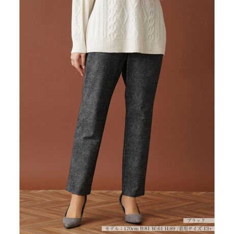 杢調の味わい深い表情の生地を使用した、すっきりとしたスリムシルエットのアンクルパンツ。生地は裏起毛素材で優しい温もりが感じられ、ストレッチが効いているので程よい伸縮性があり足捌きも良好。ウエストは総ゴム仕様とし、心地よいフィット感をもたせました。足元をさりげなく覗かせる丈感だから、パンプスを合わせてきれいめにまとめてみるのも素敵。