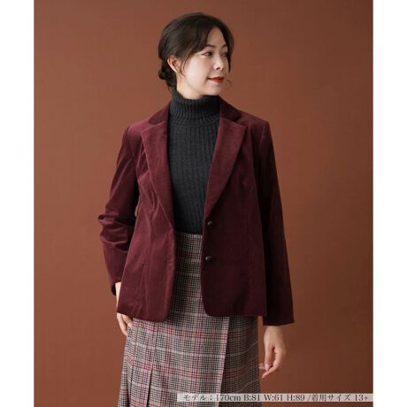 しっとりとした深みのあるカラーのコーデュロイ生地で仕立てたテーラードジャケット。存在感のある大きめのノッチドラペルがさりげなくマニッシュな雰囲気を演出。ウエスト周りを程よくシェイプし、きれいなシルエットを描き出しています。フロントで留めたバスケットボタンがこだわりを感じさせるアクセントに。ベーシックなパンツでまとめるのはもちろん、フェミニンなスカートを合わせたミックステイストのコーディネートもおすすめです。スリット入りの袖口は折り返してのアレンジも可能。