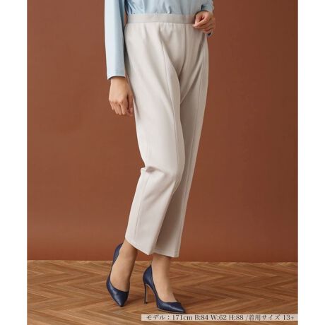 肌当たりのよいレーヨン×ナイロンをベースとした生地に、ストレッチ素材を混紡した伸縮性抜群のアンクルパンツ。レッグラインはシャープに絞り込み、すっきりとしたシルエットを描いています。ウエストゴムは総ゴム仕様で心地よいフィット感をもたせました。無駄のないベーシックなデザインでアクティブな動作にも難なく対応できるので、オンオフのシーンを選ばずに活躍してくれそうです。サイドホック&ファスナー、スナップボタンにより開閉が可能。