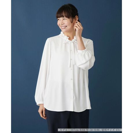 くしゅっとしたフリリーな襟にナローなボウタイをあしらった、きちんと感と可愛らしさを兼ね備えたブラウス。袖には程よいゆとりをもたせ、リラクシーな雰囲気を生み出しています。お洒落に決めたいお出かけはもちろん、オフィスやお呼ばれにもおすすめのアイテムです。一枚で着こなしはもちろん、ノーカラージャケットのインナーとしても存在感を発揮します。ボウタイは取り外し不可。