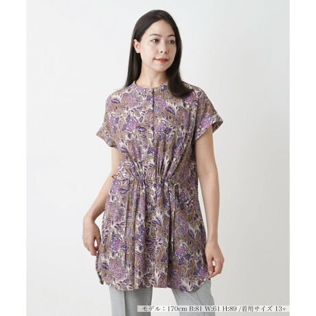 ひと味違った表情が楽しめるアーティスティックなボタニカル柄をプリントしたバンドカラーブラウス。袖はフレンチスリーブで涼やかな着心地を叶えました。すっきり見えするシルエットながら、ヒップまですっぽりと隠れる丈感なので体型カバーもお手のものです。前身頃のみウエストリボンで調整が可能。定番のパンツはもちろん、フェミニンなスカートとの相性もよく、コーディネート力にも優れたアイテムです。