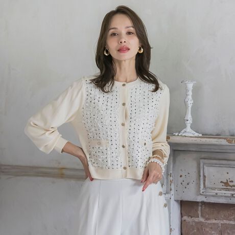 華やかシーンに寄り添うファンシーツイードのドッキングカーディガン。