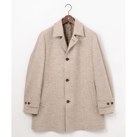 襟の形を変えられるコンバーチブル型のステンカラーコートです。やや大柄に表現されたヘリンボン柄が、装いに奥行きと洗練された印象を与えます。胴裏にはJOSEPH ABBOUDオリジナルのキュプラジャガード裏地を、ボタンにはアンティーク調の水牛釦を使用し、細部にまで高級感を追求しました。ビジネスシーンからラグジュアリーなカジュアルシーンまで、幅広い着こなしに対応する汎用性の高い一着です。