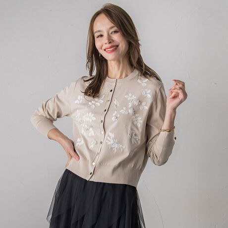 華やかなボタニカルモチーフの刺繍がポイントのクルーネックカーディガンです。