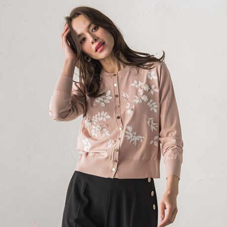 華やかなボタニカルモチーフの刺繍がポイントのクルーネックカーディガンです。